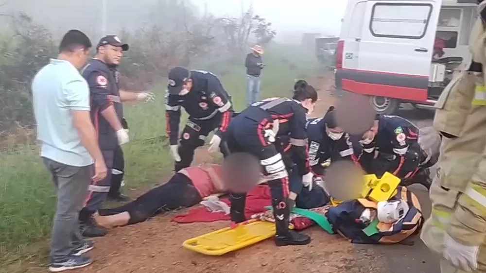 Vítima Desacordada Acidente de moto na BR-364 e deixa duas pessoas feridas a 15 km de Ariquemes— SAMU presta socorro imediato as vítimas