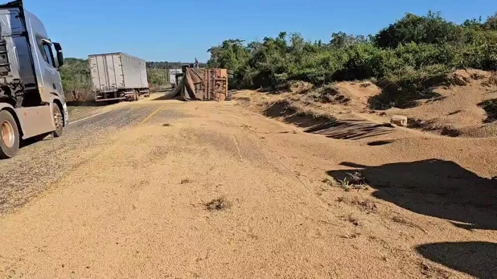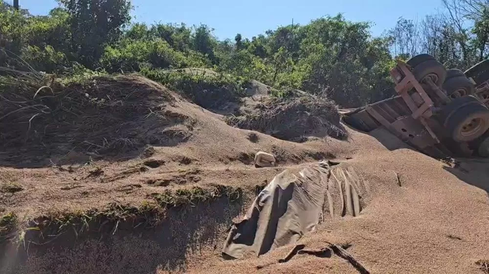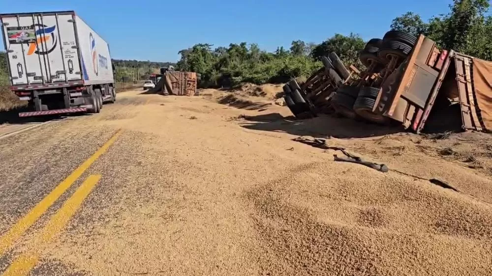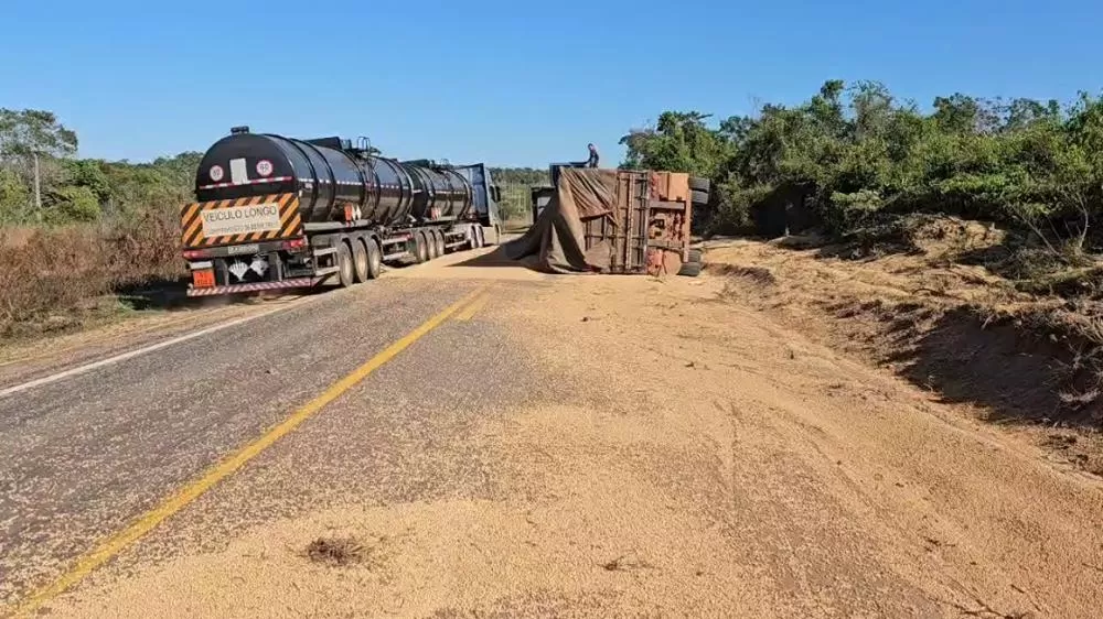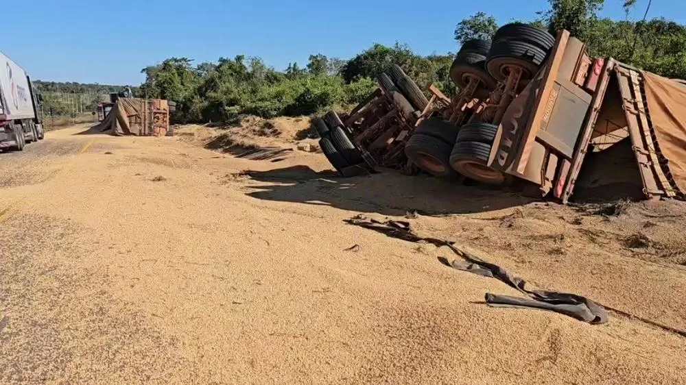 Vilhena (RO) – A manhã desta quarta-feira (6) foi marcada por mais um acidente grave na BR-174, próximo ao rio 12 de Outubro, cerca de 30 km da divisa entre Rondônia e Mato Grosso. Um rodotrem carregado de grãos tombou às margens da estrada, no mesmo trecho onde, na noite anterior, outro caminhão graneleiro já havia derramado toneladas de grãos na pista.