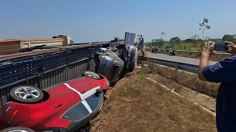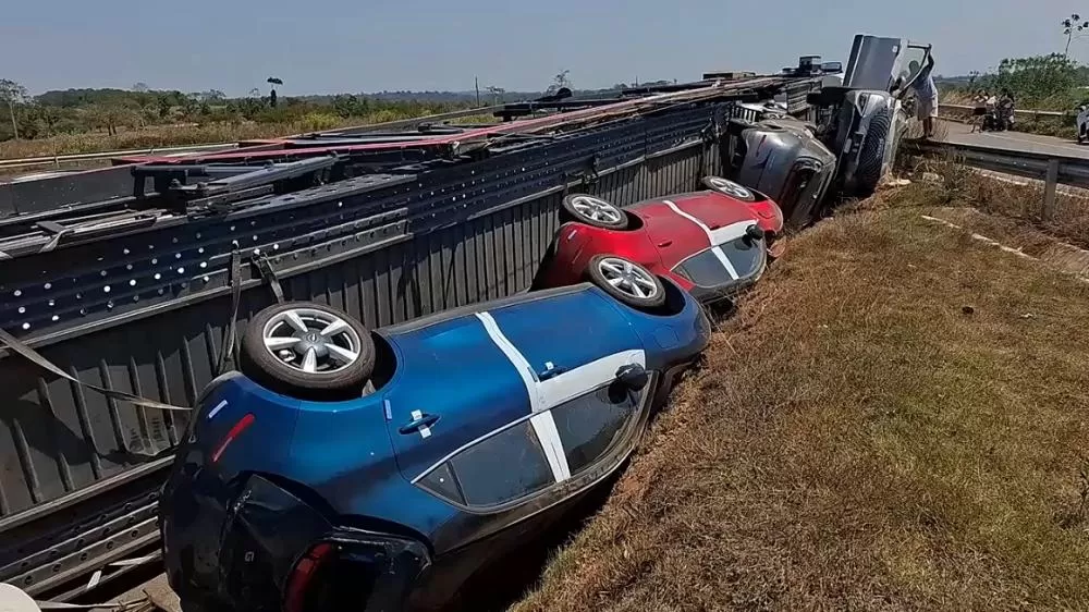 De acordo com o motorista, ele seguia pelo viaduto quando outro veículo tentou uma ultrapassagem indevida, fazendo com que perdesse o controle da direção. A carreta tombou violentamente para o lado direito da pista, destruindo completamente os veículos de alto padrão que transportava — cada um avaliado em mais de R$ 200 mil.