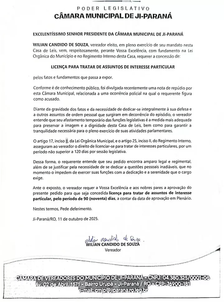 No pedido, Wilian Cândido justifica o afastamento por “motivos de interesse particular” e reforça que a medida é necessária para que ele possa se dedicar integralmente à sua defesa, após vir à tona uma ocorrência policial em que é apontado como acusado. Segundo ele, o afastamento por 90 dias, com base na Lei Orgânica do Município e no Regimento Interno da Câmara, é essencial para preservar a imagem da instituição e garantir o bom andamento dos trabalhos legislativos. Câmara de Ji-Paraná Emite Nota de Repúdio Contra Vereador Acusado de Atos Obscenos em Via Pública