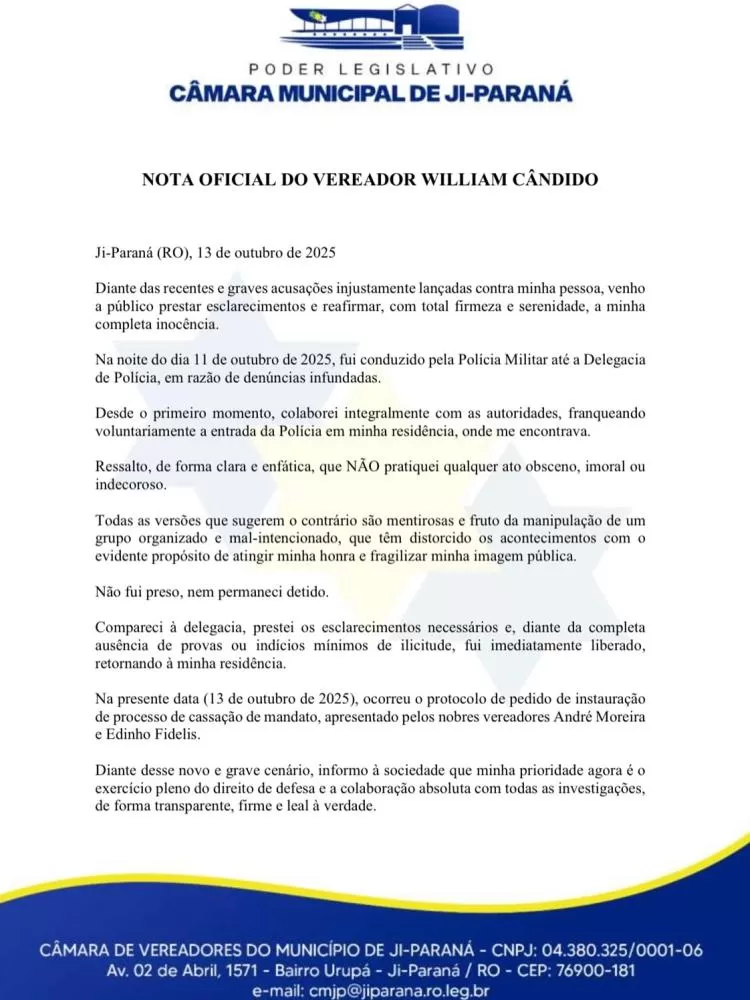 Ele finaliza a nota dizendo que acredita que “a sociedade de Ji-Paraná verá reconhecida a falsidade das acusações e a manipulação política dos fatos”. O parlamentar garantiu ainda que seguirá firme no exercício do mandato, confiando na Justiça e no apoio da população.
