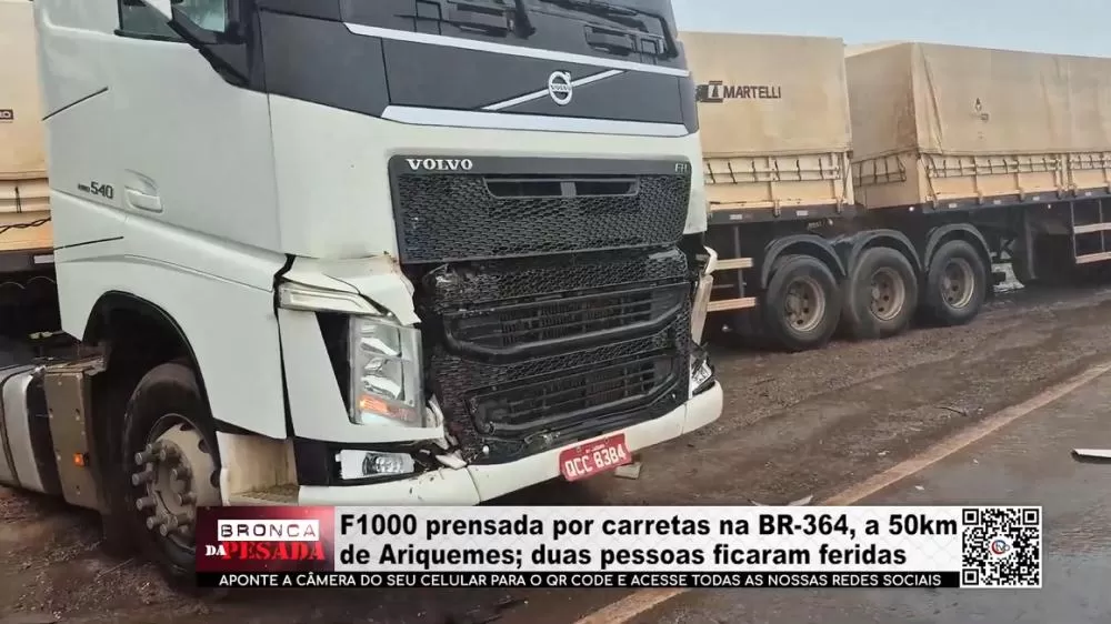 Duas pessoas ficaram feridas na tarde desta terça-feira (25) após uma F-1000 ser prensada por duas carretas na BR-364, a cerca de 50 km de Ariquemes, sentido Porto Velho. O impacto destruiu a caminhonete e deixou o tráfego lento no trecho.