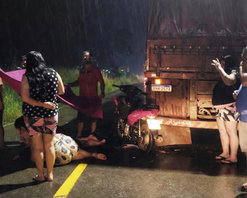 Uma mulher ficou gravemente ferida na noite de sábado, 14 de fevereiro de 2026, após bater a motocicleta Honda Biz vermelha na traseira de uma carreta estacionada na Rua Rondônia, no Residencial Bosque dos Ipês, em Ji-Paraná (RO).