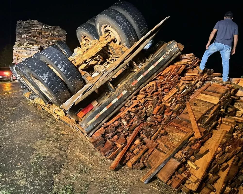 A madeira transportada pendia para o lado direito da pista, fazendo com que o reboque traseiro tombasse na margem da estrada, enquanto o caminhão que puxava os reboques permaneceu em pé. Para acompanhar o andamento das investigações e outras notícias policiais, você também pode ingressar no grupo no WhatsApp.