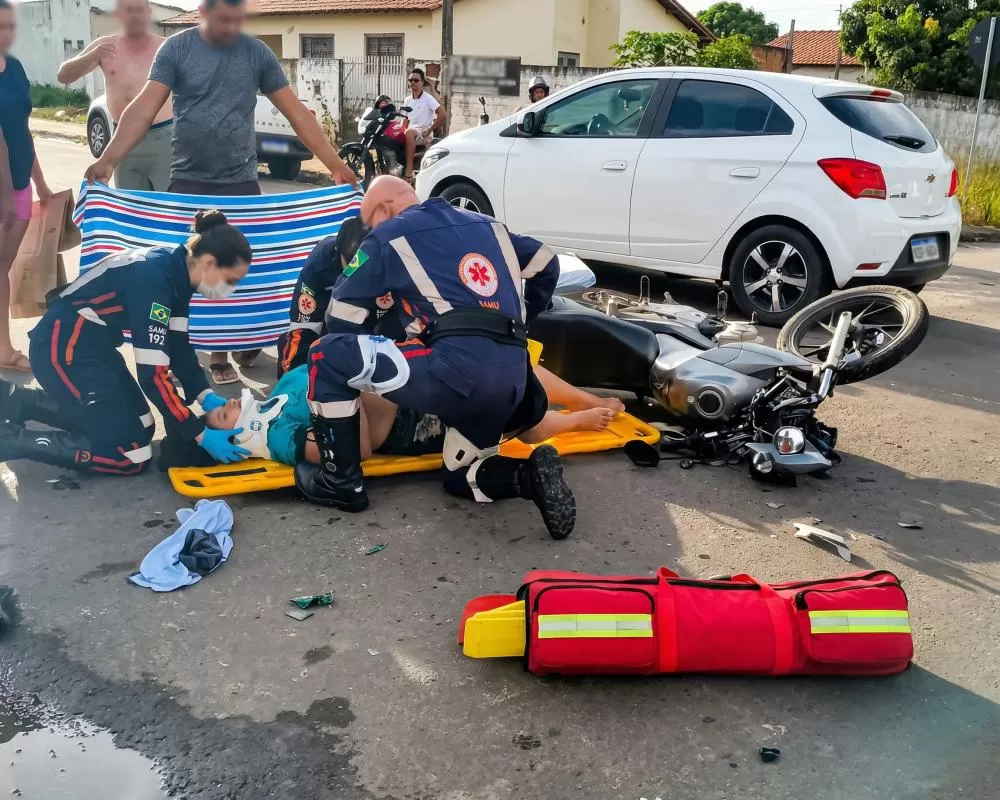 Com a força da colisão, a condutora da motocicleta foi arremessada ao solo, sofrendo diversos ferimentos e suspeita de fratura na clavícula. Já o passageiro, que estava na garupa, também foi lançado, mas teve ferimentos mais leves.